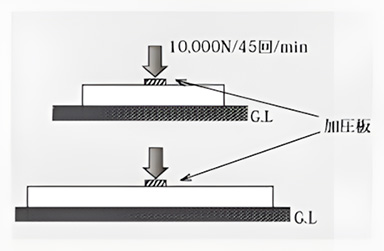 試験床に各試験品を置き、径(250×200mm)の加圧板(JIS-S-1102)を試験品の中央に置き、1,000N/45回/分の速度で加圧し、10,000回、20,000回、30,000回、40,000回、50,000回、60,000回、70,000回、80,000回で経過確認。